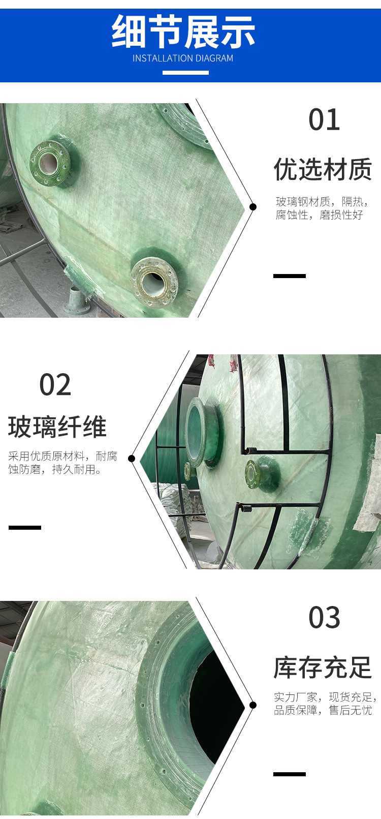山東環(huán)通復(fù)合材料有限公司成立于2011年,是從事玻璃鋼儲(chǔ)罐產(chǎn)品的企業(yè),公司位于山東濰坊安丘市。玻璃鋼儲(chǔ)罐分為:立式儲(chǔ)罐和臥式儲(chǔ)罐,有1立方、2立方3立方、4立方、5立方、10立方、12立方、15立方、20立方、25立方、30立方、50立方等,顏色分為:綠色、藍(lán)色、黃色等。公司產(chǎn)品主要分為:玻璃鋼儲(chǔ)罐容器,玻璃鋼化糞池,玻璃鋼隔油池,玻璃鋼加砂管道,玻璃鋼脫硫塔,玻璃鋼格柵,玻璃鋼防腐,玻璃鋼儲(chǔ)罐,玻璃鋼管件等。