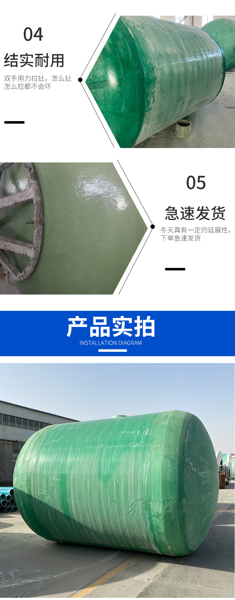 山東環(huán)通復(fù)合材料有限公司成立于2011年,是從事玻璃鋼儲(chǔ)罐產(chǎn)品的企業(yè),公司位于山東濰坊安丘市。玻璃鋼儲(chǔ)罐分為:立式儲(chǔ)罐和臥式儲(chǔ)罐,有1立方、2立方3立方、4立方、5立方、10立方、12立方、15立方、20立方、25立方、30立方、50立方等,顏色分為:綠色、藍(lán)色、黃色等。公司產(chǎn)品主要分為:玻璃鋼儲(chǔ)罐容器,玻璃鋼化糞池,玻璃鋼隔油池,玻璃鋼加砂管道